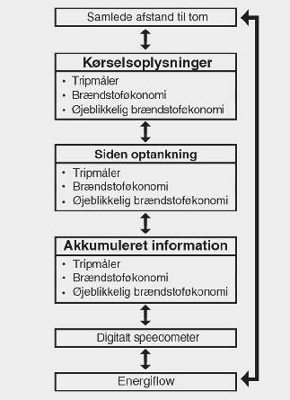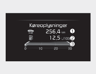 Dette display viser tripafstand (1), den gennemsnitlige brændstofeffektivitet (2) og den øjeblikkelige brændstoføkonomi (3) og den samlede information om køretid (4) en gang pr. tændingscyklus.