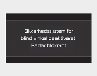 Hvis dette sker, deaktiveres 'Blind-Spot Safety system disabled. Radar blocked’ (Sikkerhedssystem for blind vinkel deaktiveret. Radar blokeret) advarselsmeddelelse vises på klyngen.