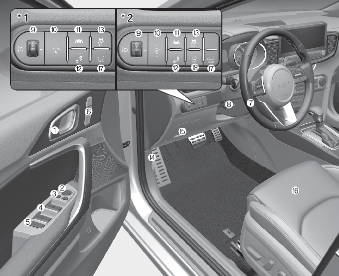الشاشة الرئيسية > لمحة سريعة عن سيارتك > نظرة عامة على الأجزاء الداخلية