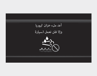 وإلا، فلن يتم إعادة تشغيل السيارة فور إيقاف تشغيل المحرك عن طريق زر ENGINE START/STOP (بدء تشغيل/إيقاف المحرك). قد تختلف المسافة بالأميال المتبقية المقتطعة عن مسافة السفر الفعلية اعتمادًا على نمط القيادة والظروف البيئية ووضع الطريق. عند ظهور رسالة "Low Urea" (انخفاض يوريا) أو رسالة "Refill Urea" (إعادة التزود بيوريا)، فيجب إضافة مقدار كافي من محلول يوريا. عندما تظهر رسالة "Refill Urea in 000 km or vehicle will not start" (أعد التزود بيوريا خلال 000 كم وإلا فلن يتم تشغيل السيارة)، أعد ملء مقدار كافٍ من محلول يوريا.