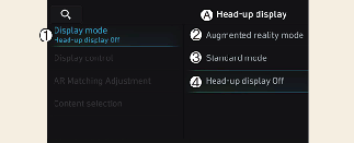 Settings (Nastavení) → Vehicle (Vozidlo) → Head-up display (Průhledový displej) → Display mode (Režim displeje) → Augmented reality mode (Režim rozšíření reality)/Standard mode (Standardní režim)