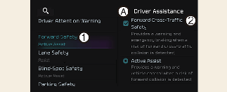 Se zapnutým vozidlem vyberte na obrazovce informačního systému Settings (Nastavení) → Vehicle (Vozidlo) → Driver assistance (Jízdní asistent) → Forward safety (Bezpečnost při jízdě) a nastavte, zda používat jednotlivé funkce.