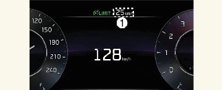 Zadane ograniczenie prędkości (1) będzie następnie wyświetlane w zestawie wskaźników. Aby przekroczyć zadane ograniczenie prędkości, należy wcisnąć pedał przyspieszenia do oporu, aktywując mechanizm wymuszonej redukcji biegu. Ustawione ograniczenie prędkości zacznie migać i emitowany będzie sygnał dźwiękowy, dopóki prędkość pojazdu nie zostanie zredukowana poniżej ograniczenia.