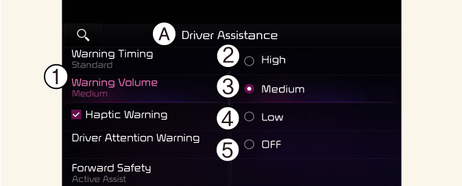 Po uruchomieniu pojazdu należy wybrać opcję Driver assistance (Wspomaganie kierowcy) → Warning volume (Głośność ostrzeżenia) w menu ustawień, aby zmienić głośność ostrzeżenia inteligentnego tempomatu na High (Głośno), Medium (Średnio), Low (Cicho) lub Off (Wył.).