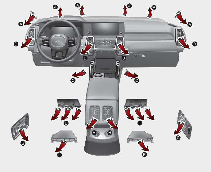 Největší proud vzduchu je namířen na podlahu, malé množství vzduchu je namířeno na čelní sklo, odmrazovače bočních oken a postranní průduchy.