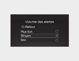 Po výběru položky „Driver Assistance → Warning Volume“ (Jízdní asistenti → Hlasitost výstrahy) z nabídky Settings (Nastavení) s tlačítkem ENGINE START/STOP (Nastartování/vypnutí motoru) v poloze ON (Zapnuto) můžete změnit hlasitost výstrahy asistenta pro předcházení čelnímu nárazu na hodnotu „High“ (Vysoká), „Medium“ (Střední), „Low“ (Nízká) nebo „Off“ (Vypnuto) (pokud je vozidlo vybaveno vibracemi volantu).