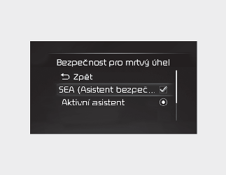 S tlačítkem ENGINE START/STOP (Nastartování/vypnutí motoru) v poloze ON (Zapnuto) zapnete varovný systém pro bezpečné vystupování výběrem položky „Driver Assistance → Blind-Spot Safety Safe Exit Assist“ (Jízdní asistenti → Detekce mrtvého úhlu → Asistence při bezpečném vystupování) z nabídky Settings (Nastavení) a zrušením výběru funkci vypnete.