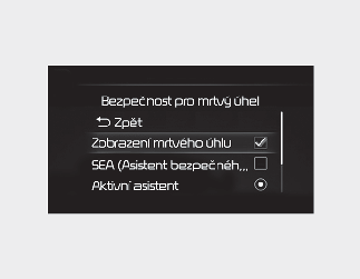 S tlačítkem ENGINE START/STOP (Nastartování/vypnutí motoru) v poloze ON (Zapnuto) zapnete systém sledování mrtvého úhlu výběrem položky „Driver Assistance Blind-Spot Safety Blind Spot View“ (Jízdní asistenti → Detekce mrtvého úhlu → Sledování mrtvého úhlu) z nabídky Settings (Nastavení) a zrušením výběru funkci vypnete.