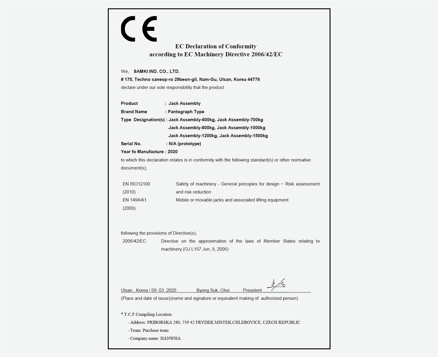 Prohlášení o shodě pro zvedák