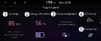Le menu hybride enfichable comporte cinq sections : [Autonomie EV], [Renseignements sur l’énergie], [Gestion de la charge management], [Conduite ECO], [Flux d’énergie].