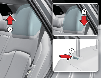 Pour abaisser l'appuie-tête, pousser et maintenir le bouton de déverrouillage (2) enfoncé sur le support d'appuie-tête et abaisser l'appuie-tête à la position voulue (3).