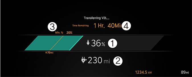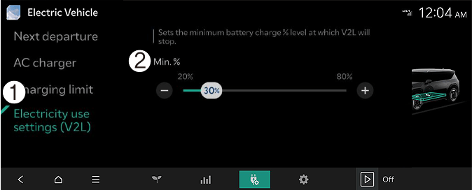 When the high voltage battery charge reaches the set discharging limit(%), the operation stops, and a warning message is displayed on the instrument cluster. If you want V2L operation, set the discharging limit(%) lower than the current battery charge.