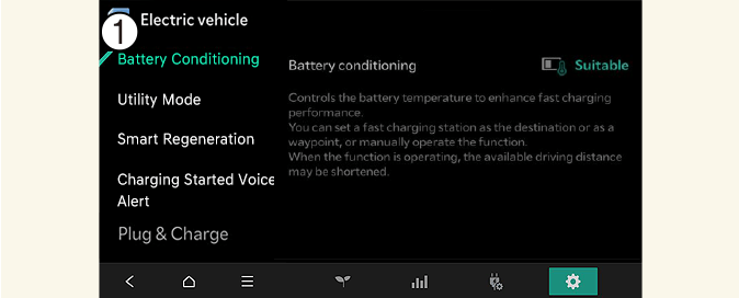If you set a DC charging station as a destination in battery conditioning mode, you can reduce the charging time by raising the battery temperature to an adequate level when you arrive.