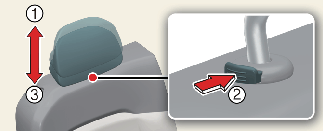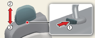 To lower the headrest, push and hold the release button (2) on the headrest support and lower the headrest to the desired position (3).