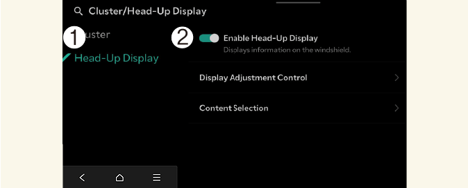After turning on the head-up display, you can change the settings of Display Adjustment Control and Content Selection of the Head-Up Display.