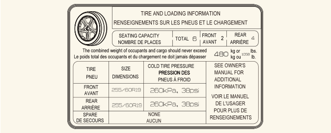 The label located on the driver's side center pillar gives the original tire size, cold tire pressures recommended for your vehicle, the number of people that can be in your vehicle and vehicle capacity weight.