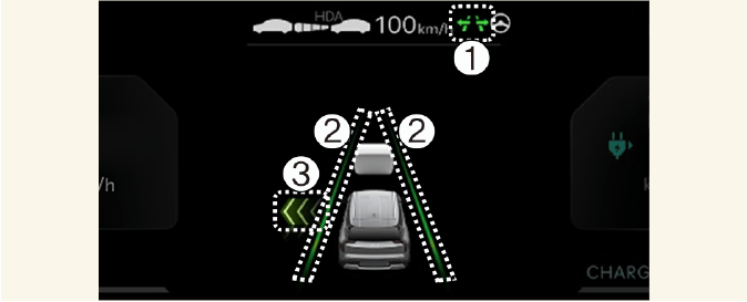 You can see the status of the Highway Driving Assist operation in the Driving Assist view on the cluster. Refer to More Details.