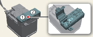 Open the 12V battery cover (1).