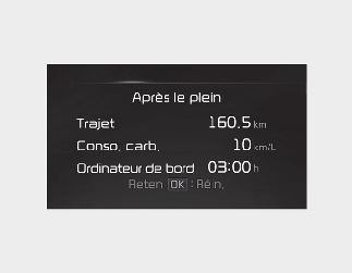 Si vous appuyez sur le bouton « OK » pendant plus de 1 seconde après l'affichage des informations depuis que le plein a été effectué, les informations sont réinitialisées.