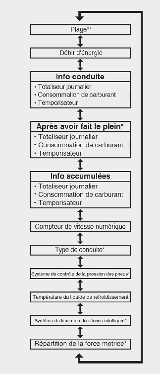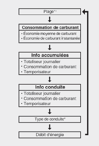 Cet affichage donne des informations sur la distance du trajet, le rendement moyen en carburant et la durée totale du trajet une fois par cycle d'allumage.