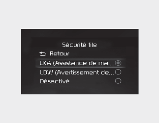 Avec le bouton de démarrage/arrêt du moteur en position ON, sélectionnez ou désélectionnez 'Driver Assistance (Assistance au conducteur) → Lane Safety (Sécurité de voie)' dans le menu Paramètres pour définir si vous souhaitez ou non utiliser chaque fonction.