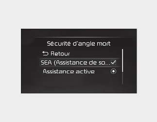 Lorsque le bouton ENGINE START/STOP (démarrage/d'arrêt du moteur) est en position ON, (dé)sélectionnez « Driver Assistance (Assistance conducteur) → Blind-Spot Safety (Sécurité d'angle mort) → Safety Exit Assist (Aide à la sortie sécurisée) » dans le menu Réglages pour activer ou désactiver l'aide à la sortie sécurisée.