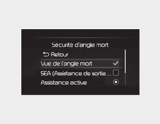 Lorsque le bouton de démarrage/d'arrêt du moteur est en position ON, (dé)sélectionnez « Driver Assistance (Assistance du conducteur) → Blind-Spot Safety (Sécurité d'angle mort) → Blind Spot View (Moniteur d'angle mort) » dans le menu Réglages pour activer et désactiver le moniteur de vision d'angle mort.