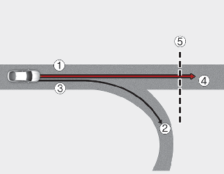 Lorsque l'itinéraire de conduite du véhicule est reconnu comme étant la route principale en maintenant la route principale au lieu de l'itinéraire réglé par le système de navigation, la fonction de ralentissement automatique dans les courbes sur l'autoroute est opérationnelle. Selon la distance jusqu'à la courbe et la vitesse actuelle du véhicule, la décélération du véhicule peut ne pas être suffisante ou ralentir rapidement.