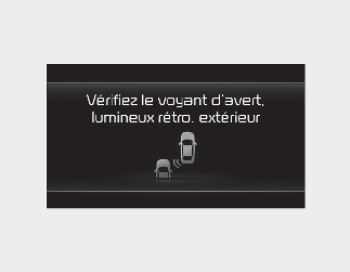 Lorsque le témoin du rétroviseur extérieur ne fonctionne pas correctement, le message « Check side view mirror warning light (Vérifiez le témoin du rétroviseur extérieur) » apparaît sur le combiné d’instruments. Faire inspecter le véhicule par un atelier professionnel. Kia recommande de consulter un concessionnaire/réparateur agréé Kia.