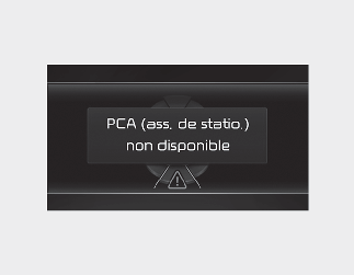 Lorsque le système d'aide à l'évitement de collision de stationnement en marche arrière ou d'autres fonctions connexes ne fonctionnent pas correctement, le message « Check Parking Collision-Avoidance Assist system (Vérifiez l'aide à l'évitement de collision en cas de stationnement en marche arrière) » apparaît sur le combiné d’instruments, et la fonction se désactive automatiquement. Faire inspecter le véhicule par un atelier professionnel. Kia recommande de consulter un concessionnaire/réparateur agréé Kia.