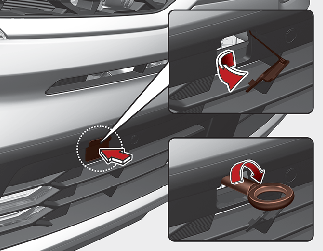 Pour installer le crochet de remorquage, introduisez-le dans le trou et tournez-le dans le sens des aiguilles d’une montre