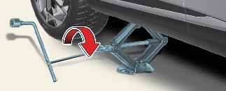Włożyć uchwyt do podnośnika i obracać go zgodnie z kierunkiem ruchu wskazówek zegara. Podnosić pojazd do momentu, gdy opona znajdzie się tuż nad ziemią. Przed wyjęciem nakrętki kół upewnić się, że pojazd jest stabilny.