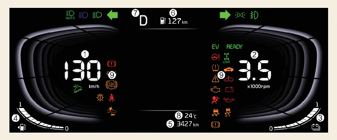 ECO: Zeigt an, dass das Fahrzeug umweltfreundlich gefahren wird.