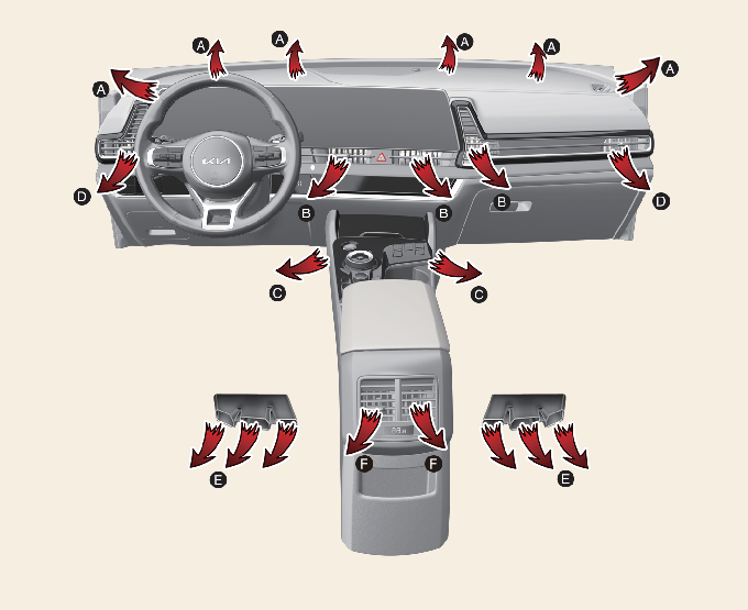 Der größte Teil des Luftstroms wird zum Boden geleitet, ein kleiner Teil zu den Lüftungsdüsen für die Windschutzscheibe,die Seitenscheiben und den seitlichen Lüftungsdüsen. |