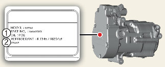 Etykieta sprężarki zawiera informacje na temat typu sprężarki zamontowanej w pojeździe ze wskazaniem modelu, numeru części dostawcy, numeru produkcyjnego, czynnika chłodniczego (1) i oleju sprężarkowego (2).