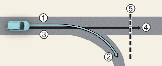 [1]: główna droga, [2]: odgałęzienie, [3]: trasa, którą pojazd jedzie, [4]: ustawiona trasa, [5]: kręty odcinek drogi