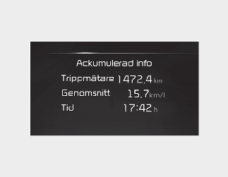 Denna display visar den ackumulerade färdsträckan, den genomsnittliga bränsleeffektiviteten och den totala körtiden.