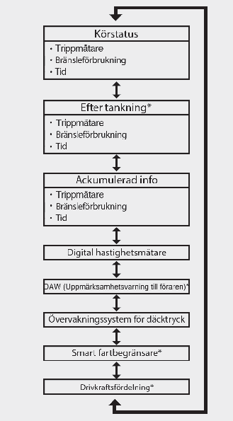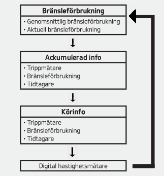 Denna display visar färdsträckan, genomsnittlig bränsleförbrukning och total körtid informationen uppdateras en gång per en tändcykel.