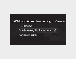 Om 'Leading Vehicle Departure Alert' (Startvarning för framförvarande fordon) väljs, informerar funktionen föraren när framförvarande fordon börjar köra efter att ha stått stilla.