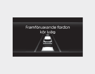 “Leading Vehicle Departure Alert” (Startvarning för framförvarande fordon) informerar föraren när framförvarande fordon börjar köra. Systemet visar meddelandet “Leading vehicle is driving away” (eller “Leading vehicle is driving on”) (framförvarande fordon börjar köra) samtidigt som en hörbar varning ljuder.