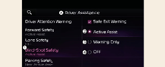 Avec le véhicule allumé, sélectionnez ou désélectionnez Assistance au conducteur → Sécurité d'angle mort dans le menu Réglages pour déterminer s'il faut ou non utiliser chaque fonction.