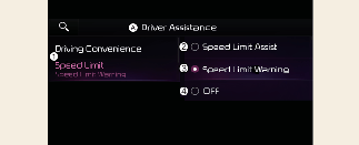 Véhicule allumé, sélectionnez ou désélectionnez Assistance au conducteur → Limite de vitesse dans le menu Réglages pour déterminer s'il faut ou non utiliser chaque fonction.