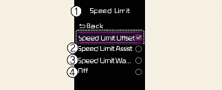 La fonction d'assistance de limite de vitesse fonctionne sur la base du réglage de décalage ajouté à la limite de vitesse. Si vous voulez modifier la vitesse réglée conformément à la limite de vitesse, réglez le décalage sur 0.