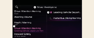 Si vous changez le délai d’avertissement, le moment de l'avertissement des autres systèmes d’assistance peut changer. Si le véhicule est redémarré, le délai d'avertissement d'avertissement d'attention du conducteur conservera le dernier réglage.