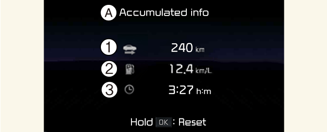การรีเซ็ตข้อมูลนี้ด้วยตนเอง ให้กดปุ่ม OK บนพวงมาลัยค้างไว้เมื่อดูข้อมูลสะสม