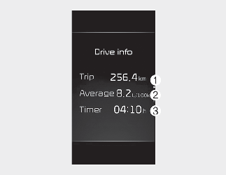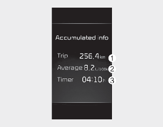 This display shows the trip distance (1), the average fuel efficiency (2), and the total driving time (3) information once per one ignition cycle.