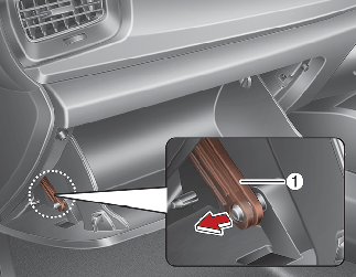 With the glove box open, pull the support strap (1).