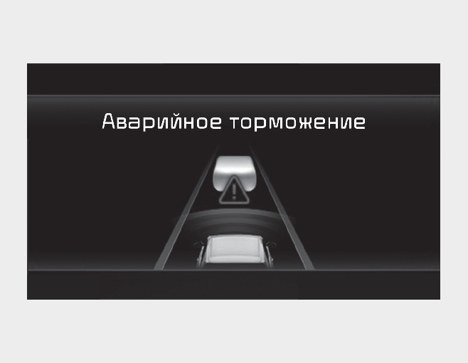 • Чтобы предупредить водителя о применении торможения, на приборную панель выводится предупреждающее сообщение «Emergency Braking» (Аварийное торможение). Одновременно звучит звуковое предупреждение, и рулевое колесо начинает вибрировать.