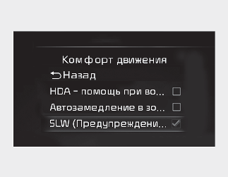 • Если выбран пункт Speed Limit Warning (Предупреждение об ограничении скорости), интеллектуальная система предупреждения об ограничении скорости движения будет информировать водителя об ограничениях скорости. Она также будет предупреждать водителя в случае превышения скоростного режима.