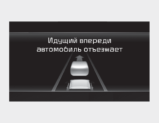 Когда обнаруженный впереди автомобиль начинает движение, функция контроля отъезда впереди стоящего автомобиля оповещает водителя с помощью сообщения «Leading vehicle is driving away» (Идущий впереди автомобиль отъезжает) на приборной панели и звукового предупреждения.